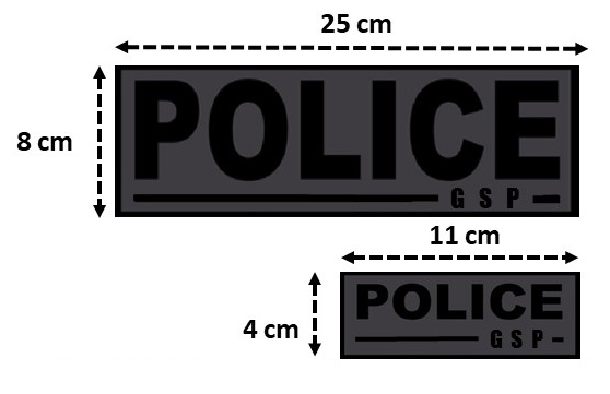 Marquage dos et face : Police - Nationale Broderie sur velcro. Existe en deux modèles : - Basse Visibilité : lettres noires sur fond gris - Haute Visibilité : lettres argent sur fond noir Existe en deux formats : - Format veste : 28x10 cm et 11x4 cm - Format harnais : 25x8 cm et 11x4cm Article réservé aux professionnels autorisés. Nous consulter.